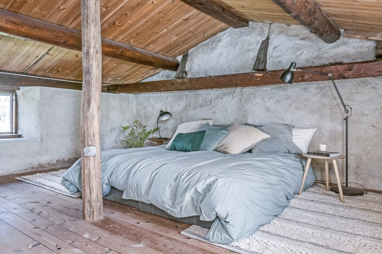 Ložnice ve venkovském stylu ve vás probudí jedinečný pocit bezpečí. Zelené a modré odstíny barev perfektně ladí s přírodním dřevem.