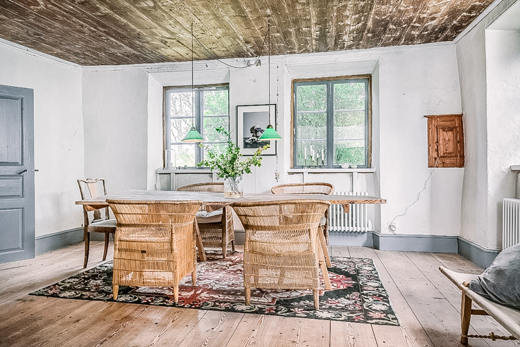 Svěží a krásná jídelna se pyšní tmavou dřevěnou podlahou a stropem. Jednoznačným skvostem je ručně vyrobený dřevěný stůl v kombinaci s moderními lampami.