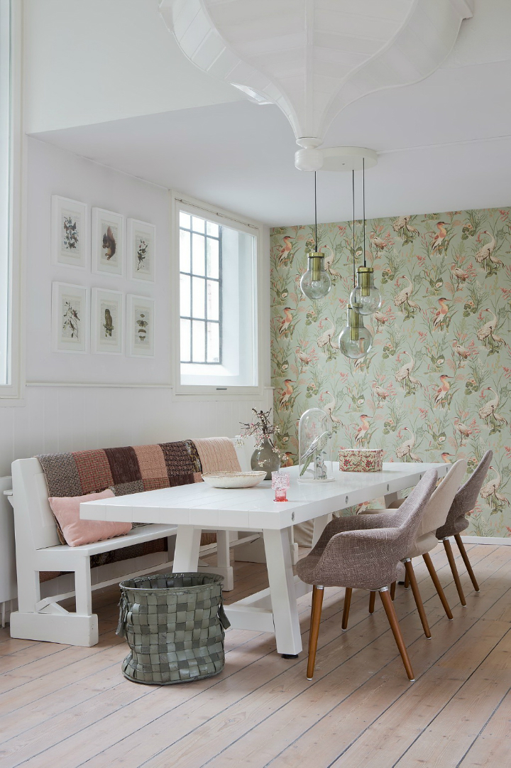Velmi půvabně působí výrazná tapeta s květinovými a ptačími motivy na vysoké stěně u jídelní části. Měkké polštáře a čalouněné židle dotváří pocit útulnosti.