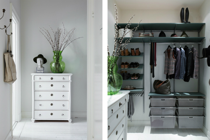Chodbu zdobí zelená skleněná váza s jarními kočičkami a místnosti vůbec nevadí, že šatní skříň nemá dveře.