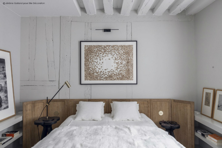Ložnici s přírodními tóny ocení zejména ti, kteří si potrpí na neopracovaném dřevě. Přiznané trámy skvěle korespondují s čelem postele.