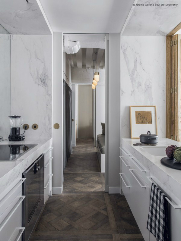 Kuchyně má z praktického hlediska obdélníkový tvar. Hlavním důvodem je vytvoření dostatečného místa pro jídelnu. Mramorová kuchyňská deska a obklady jsou základem elegance.