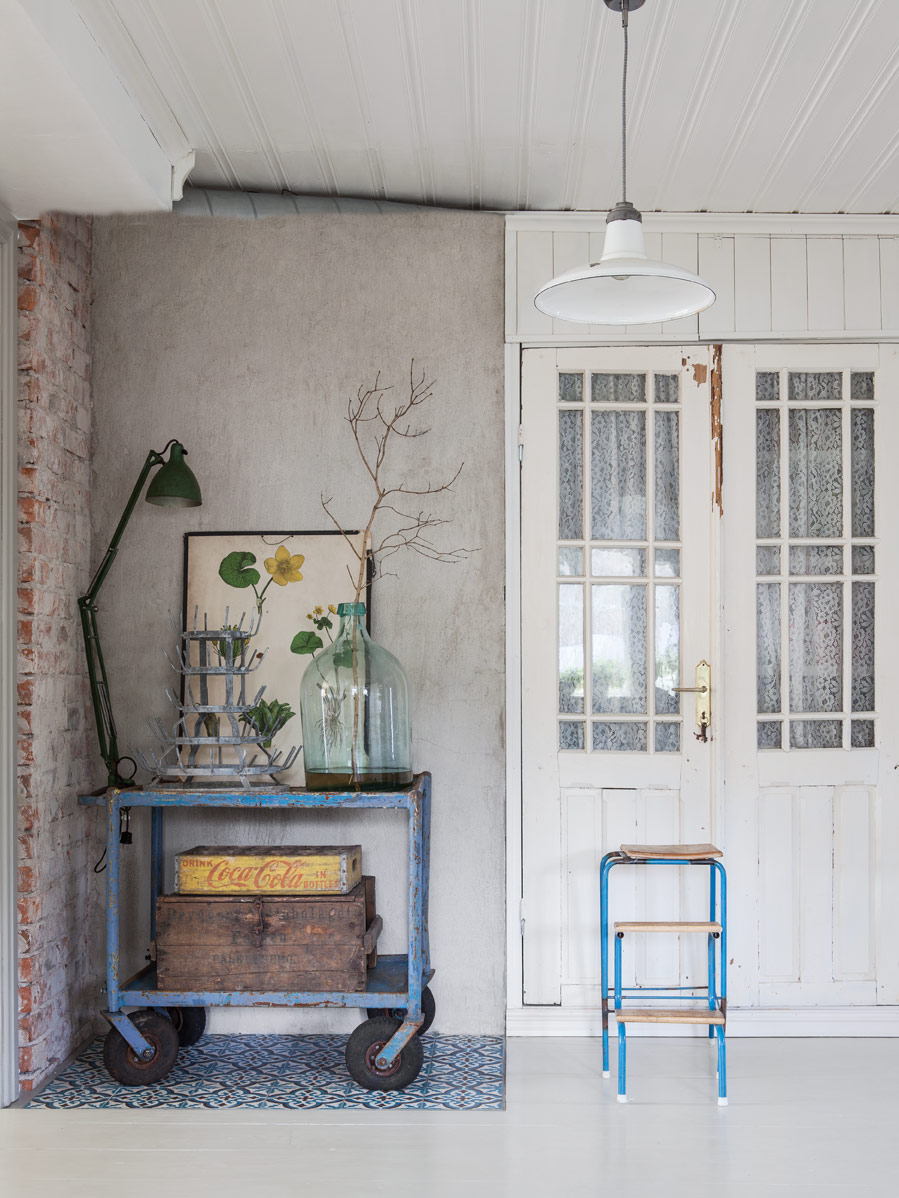 Interiér je oživen jemnou zelenou barvou, která se v rodině ihned stala velmi oblíbenou. Židle byly nalezeny ve staré průmyslové hale.
