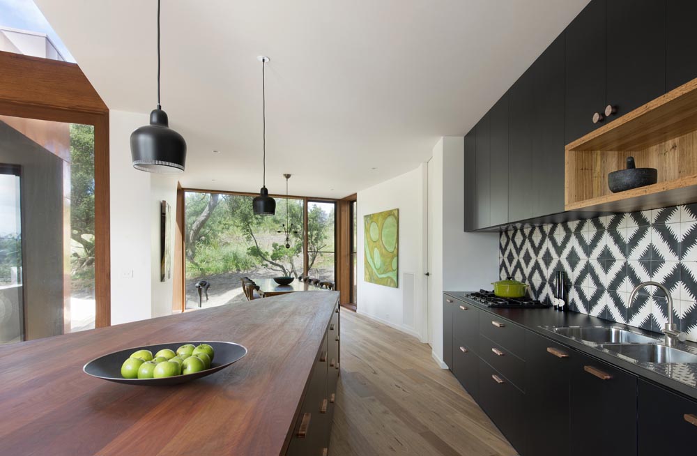 Ano, i černá patří do kuchyně! Nebojte se moderních kombinací v podobě bílé a černé barvy. Černé skříňky jsou podpořeny kontrastním obkladem. Styl celé kuchyni dodávají černé matné lustry a moderní obrazy.