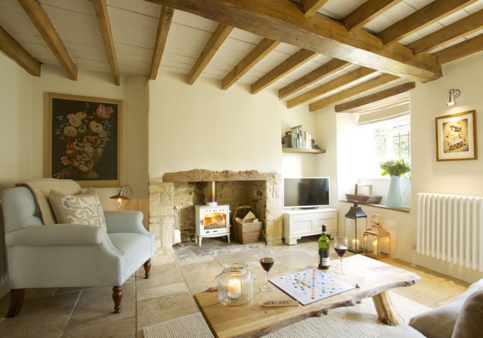 Centrum obývacího pokoje tvoří krb, jehož kouzlo spočívá v dokonalé domácí atmosféře. Původní trámy jsou nejen praktickým, ale také dekorativním přínosem do celého interiéru.