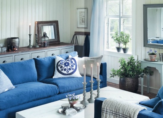 Světle modrá barva rozzařuje tento obývací pokoj. Blankytná sedací souprava skládající se ze dvou látkových pohovek vybízí k příjemnému posezení. Ozdobné malé polštářky vypadají na pohovce roztomile. Mezi pohovkami je postaven nízký bílý konferenční stolek s ozdobnými svícny jako dekoracemi. V místnosti je mnoho živých rostlin různě rozestavěných po strategických místech - na parapetu, na zemi u stolu v mosazném kvetináči či jako dekorace na stolcích.