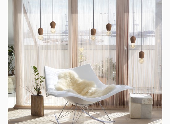 Designové bílé křeslo na fotografii je inspirováno oblíbeným motivem lastury. Kožešina mu přidává navíc image ve stylu eko, který podporují také dřevěné žárovky v interiéru obývacího pokoje. Usaďte se do svého bílého křesla!