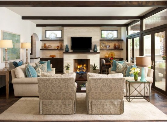 Moderní obývací pokoj ve venkovském stylu. Příjemný a klidný interiér, který se nese v přírodních tónech, je uspořádán na střed. Výraznými prvky jsou velká francouzská okna, orámována tmavým dřevem. Za zmínku stojí i velmi precizně opracované dřevěné rámy. Inspirujte se!