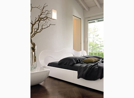 Nízká bílá postel se zcela atypickým vyřezávaným čelem tvoří dominantu této ložnice. Oblé tvary jsou pro ložnici na obrázku charakteristické ve všech jejich detailech. Obliny utváří čelo postele a oblý je nízký bílý stolek ve vysokém lesku, na kterém je ve vysoké skleněné váze postavena dekorační větev. Extravagantnost ložnice podtrhuje i zvolené černé povlečení, které se jen tak nevidí.