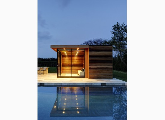 Saunování je velmi zdravé a přínosné pro lidský organismus. Zatímco ostatní ale musí docházet do veřejných saun, někteří mají to štěstí, že mají svou vlastní saunu přímo na zahradě. Malý domeček, ve kterém se sauna nachází, je obložen tropickým dřevem a vstup zajišťují velkoformátové prosklené dveře. Jeho umístění přímo u bazénu, zajišťuje okamžité ochlazení organismu po saunování a zároveň díky bodovému osvětlení uvnitř domku, získává prostředí bazénu intimní atmosféru.
