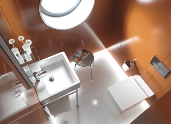 Moderní koupelna na fotografii zaujme nápaditou kombinací hranatých tvarů a kulatého okna. Stále oblíbenější hrany vtisknou vaší koupelně image dynamického, exkluzivního interiéru, z něhož budou všechny návštěvy nadšeny.