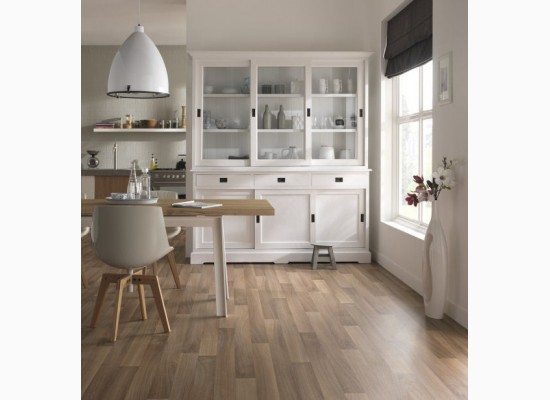 Moderní skandinávská kuchyně s jídelnou, kterou vidíte na fotografii, má skvělý stylový prvek v podlaze z novilonu. Imitace prkenné podlahy perfektně ladí s typicky skandinávským bílým nábytkem. Inspirace pro skandinávskou kuchyni - moderní podlaha z novilonu!