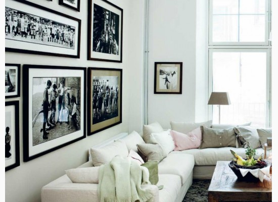 Skandinávský obývák skvěle kombinuje velkou rohovou sedačku s černobílými fotografiemi na stěnách. Zatímco velká bílá sedačka s bílými, růžovými či neutrálně zbarvenými polštáři vybízí k pohodlnému spočinutí, černobílé fotky v černých rámech dodávají interiéru atmosféru vznešenosti a uměleckou vizáž.