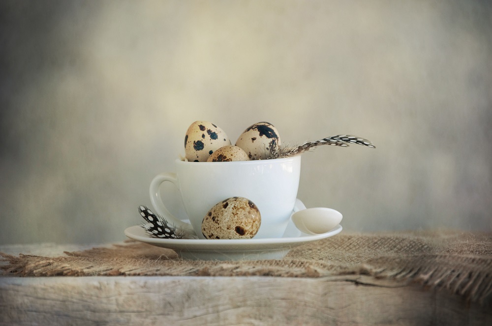 Romantické francouzské Velikonoce vytvoříte i pomocí kombinace jemných růžových květů, lehoučkých kropenatých peříček a křepelčích vajíček.
